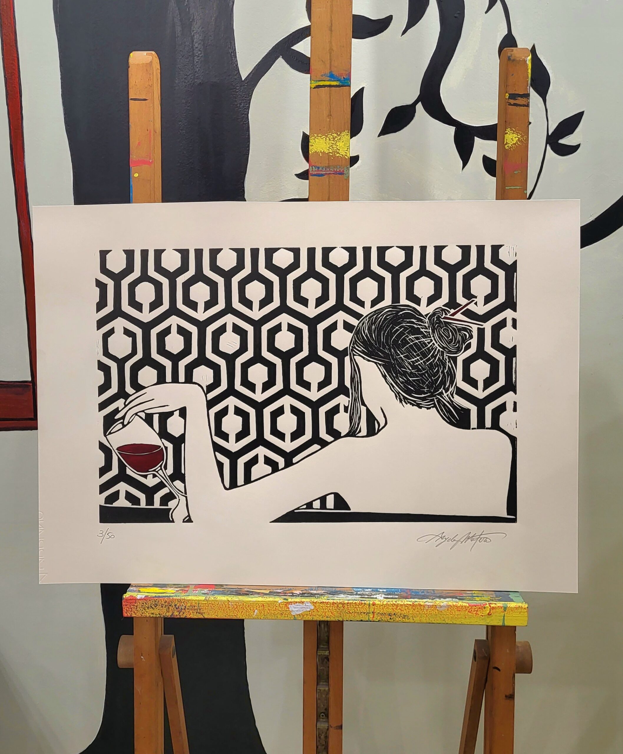 Painting on canvas, linocuts, wood, zinc, collagraph, monoprint, collage … are the techniques that the artist mainly uses. The peculiarity of her work consists in enriching each work with collages of fabrics or papers purchased during her travels, or made by her, which make the prints “unique” despite being part of a limited edition.